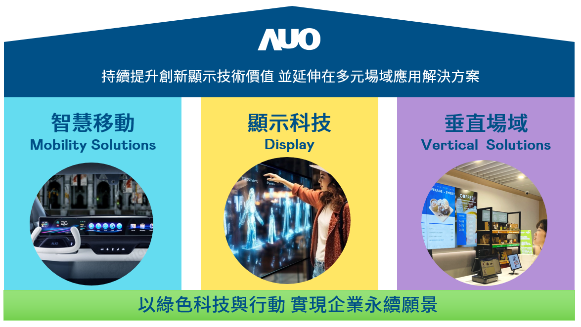 我們持續推動「雙軸轉型」,在精進顯示技術附加價值(Go Premium),與深化垂直市場應用(Go Vertical)的策略下,對應AG庄闲的優勢競爭力與趨勢,我們奠定顯示技術、智慧移動、垂直場域三大永續營運支柱,在顯示技術領域的根基之上,延伸布局多元場域應用解決方案。將先進顯示科技助力智慧移動及垂直場域發展,並以綠色科技與行動為實踐,在轉型之路上貫徹永續經營之願景。